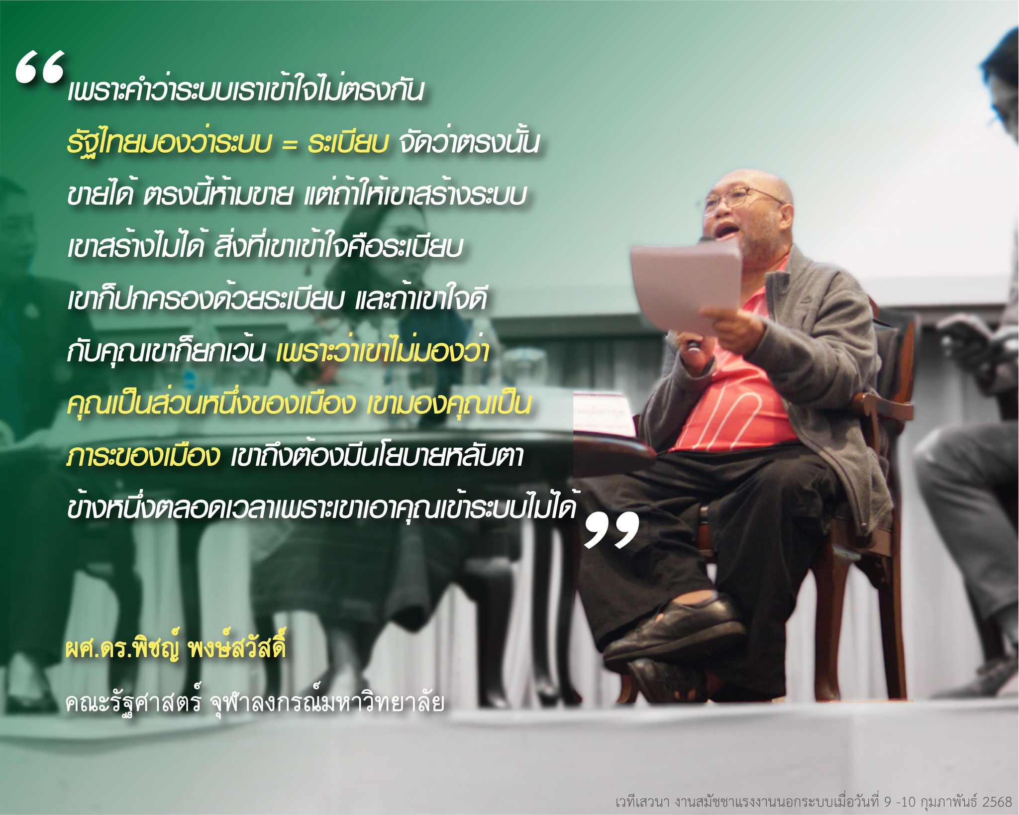 และจากข้อเสนอเชิงนโยบายที่ได้มาจากภายในงานทั้งหมด มีข้อที่น่าสนใจอยู่มาก เช่น การสนับสนุนประกันสังคมถ้วนหน้า (Universal Social Security) ซึ่งเป็นข้อเสนอที่สะท้อนปัญหาสำคัญของแรงงานนอกระบบในไทย ซึ่งกว่า 60% ของแรงงานทั้งหมดมักอยู่นอกระบบการคุ้มครอง และถ้าเดินหน้าทำได้จริง จะทำให้แรงงานทุกคนมีหลักประกันทางสังคมขั้นพื้นฐาน ไม่ว่าจะอยู่ในมาตราใด (33, 39, 40) หรือทำอาชีพอะไร โดยแนวทางนี้ยังสอดคล้องกับความเป็นธรรมทางสังคม (social justice) และแนวโน้มสากลที่ผลักดันให้แรงงานทุกกลุ่มมีสิทธิขั้นพื้นฐานเท่าเทียมกัน หรือ การช่วยเหลือแรงงานที่ได้รับผลกระทบจากสภาพภูมิอากาศ โดยเฉพาะข้อเสนอ การสนับสนุนให้ผู้ขับขี่มอเตอร์ไซค์รับจ้างเปลี่ยนมาใช้ยานพาหนะไฟฟ้า ถือเป็นมาตรการที่เชื่อมโยงประเด็นแรงงาน–สิ่งแวดล้อม–พลังงานเข้าด้วยกัน นอกจากจะช่วยแรงงานลดค่าใช้จ่ายและเสี่ยงต่อมลพิษแล้ว ยังสอดรับกับเป้าหมายด้านการลดคาร์บอนของประเทศ ข้อเสนอนี้สะท้อนถึงการมองแรงงานนอกระบบในฐานะ “ผู้ได้รับผลกระทบโดยตรง” จากภาวะโลกรวน และควรมีมาตรการเฉพาะเพื่อเยียวยา